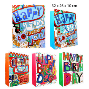 Bolsa de regalo para cumpleaños de 32 cm, ideal para sorprender con estilo en celebraciones especiales. Fabricada en papel resistente con asas firmes y diseños alegres que transmiten diversión. Perfecta para envolver obsequios medianos como perfumes, accesorios o dulces. Añade un toque festivo y colorido a cada detalle.
