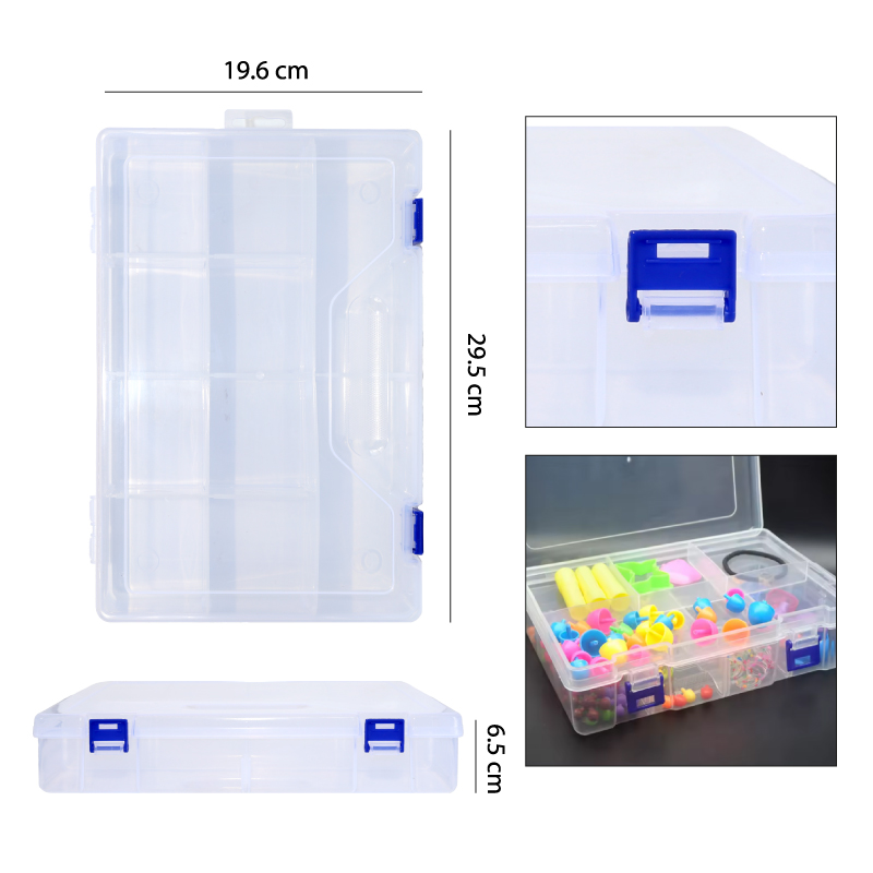 Práctica y funcional, esta caja organizadora de plástico cuenta con 10 compartimientos ideales para mantener en orden accesorios, bisutería, insumos de manualidades o pequeños objetos. Resistente y compacta, es perfecta para el hogar, oficina o talleres.