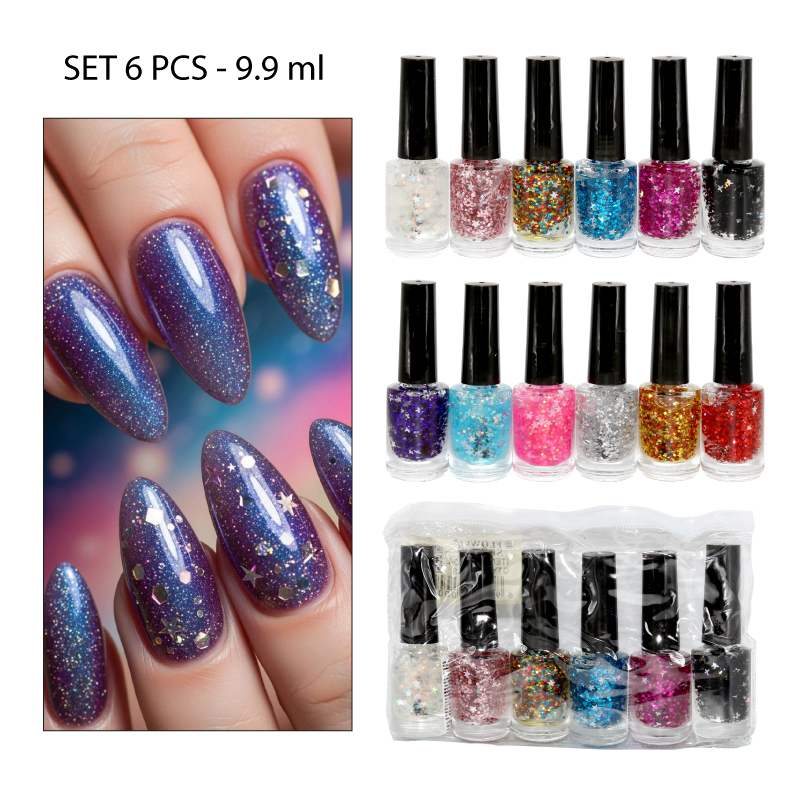 Un set lleno de brillo para desatar tu creatividad. Este pack incluye 6 esmaltes con glitter y pequeñas estrellas decorativas, perfectos para darle un toque mágico y luminoso a tus uñas en segundos.