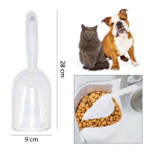 Pala de plástico grande para alimentos de mascotas, ideal para medir y servir croquetas o premios de manera práctica y sin derrames, manteniendo la comida siempre organizada y limpia.