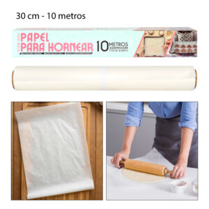 Un básico indispensable en tu cocina. Este papel para hornear blanco ofrece 10 metros de largo por 30 cm de ancho, perfecto para preparar todo tipo de recetas sin que los alimentos se adhieran.