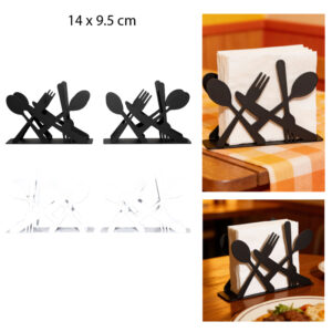 Combina diversión y practicidad con este porta servilletas metálico con diseño de cubiertos. Resistente y funcional, mantiene tus servilletas siempre a mano mientras añade un toque adorable y original a tu mesa en cualquier ocasión.