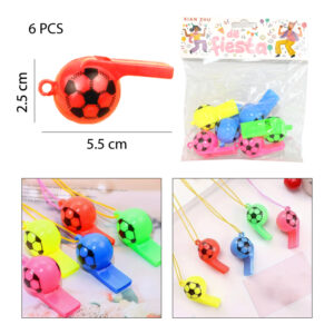 ¡Que empiece el juego! Este set de 6 silbatos plásticos de colores es ideal para partidos de fútbol, actividades deportivas, juegos infantiles y celebraciones temáticas. Cada silbato es liviano, resistente y emite un sonido claro para organizar, animar y dirigir cada momento.